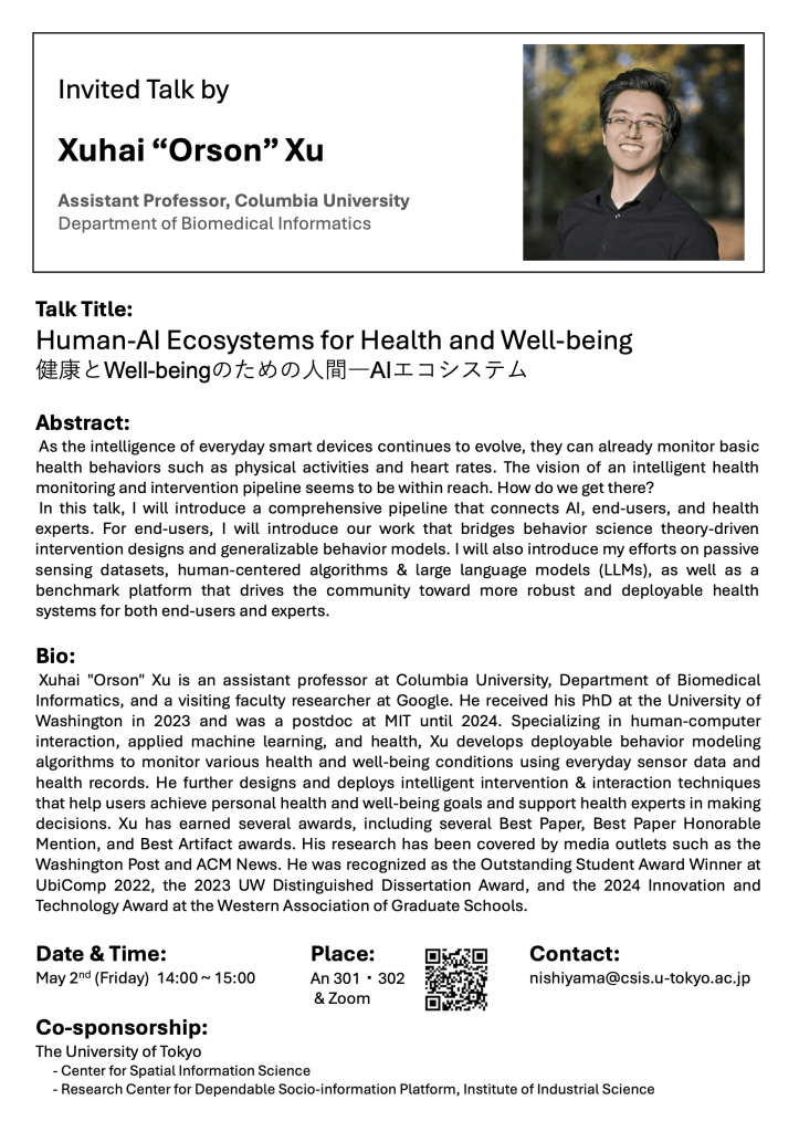 5月2日、コロンビア大学のXuhai “Orson” Xu助教授が東京大学生産技術研究所(駒場Ⅱキャンパス)にて講演をされます。Xu先生は主に人の行動・状態認識や介入手法に関する研究を行なっています。ご興味のある方はぜひご参加ください。