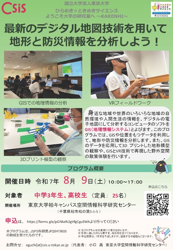 中学3年生と高校生向けの夏休み地理講座、ひらめき☆ときめきサイエンス「最新のデジタル地図技術を用いて地形と防災情報を分析しよう!」(実施代表者:小口高)の申し込み受付が始まっています。この講座では、地理情報システム(GIS)や位置情報をもつデータを利用して、地形や防災の情報を分析します。また、GISのデータを用いて作成したVRアプリを体験したり、3Dプリントした地形模型を観察したりする実習も行います。