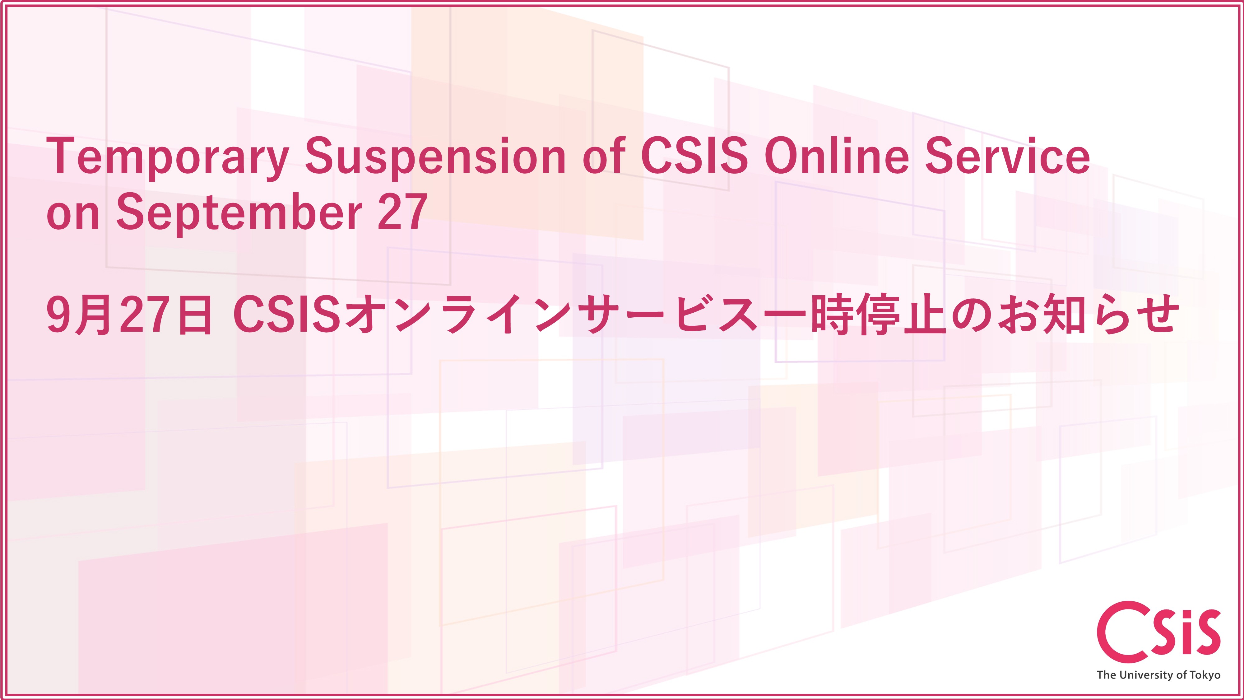 All online services provided by our Center will be temporarily suspended as follows due to inspection of the power facilities at Kashiwa Campus. We apologize for any inconvenience this may cause and appreciate your understanding. Services will be gradually restored after the inspection is completed.